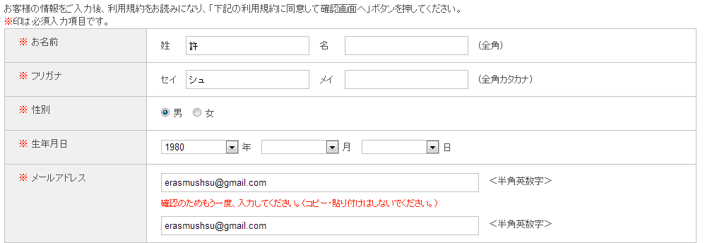 第一步:依序填入姓名、片假名、性別、出生年月日與EMAIL